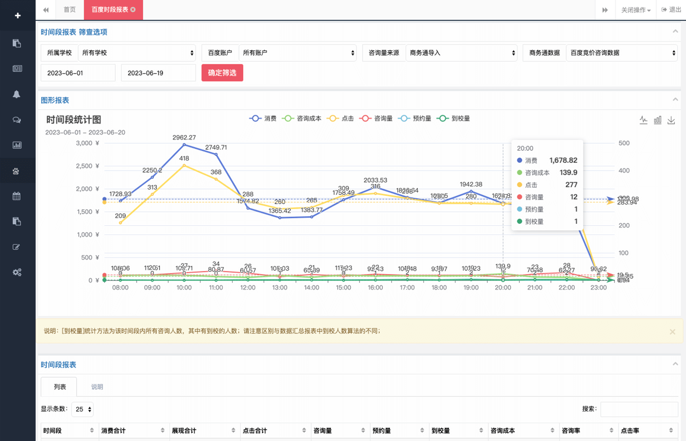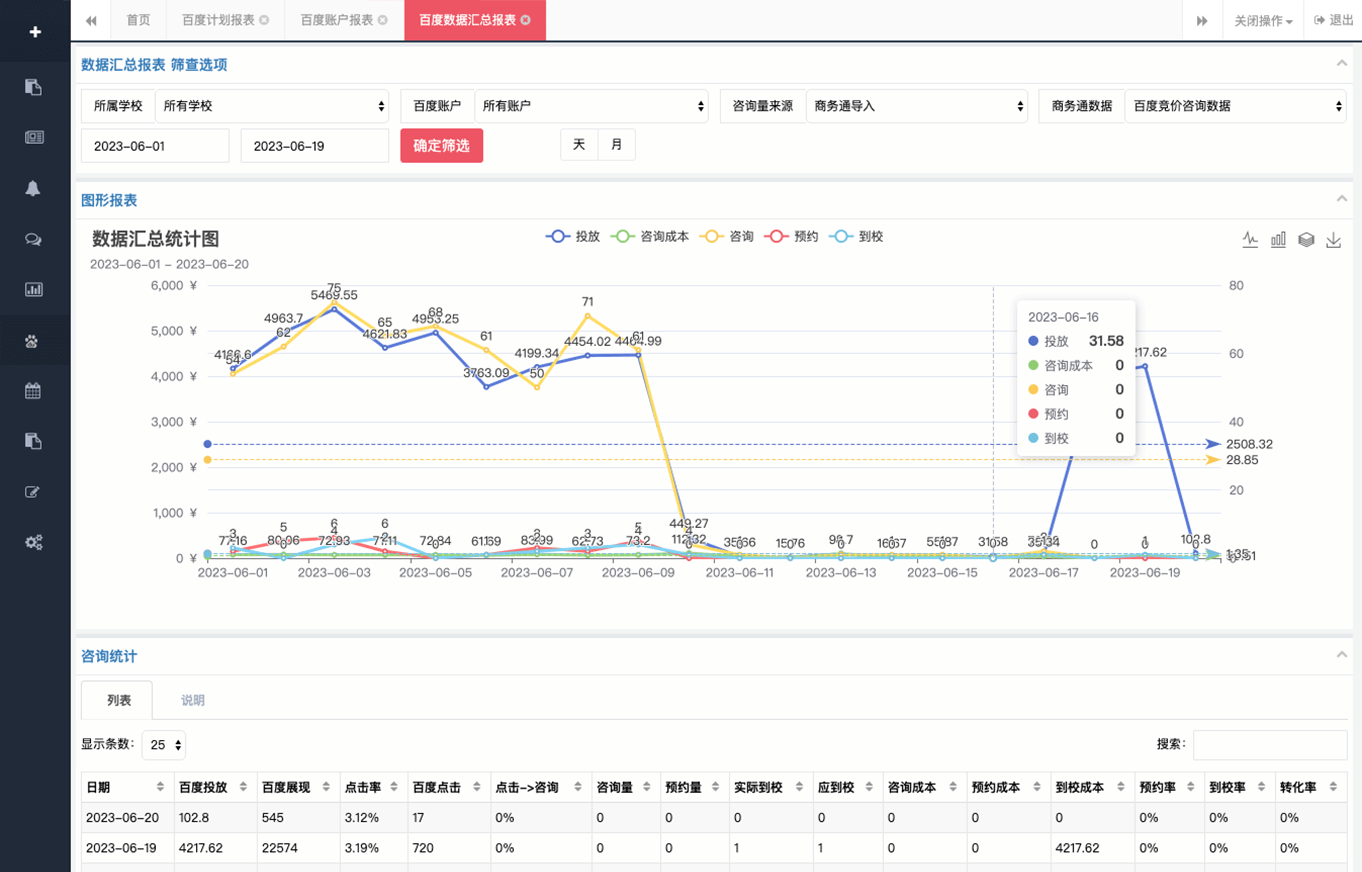 CRM系統通過聚合百度競價接口投放數據,從學生咨詢至到校過程提高咨詢人員效率和客戶信息利用率,可有效控制成本、提高營銷精準度幫您提升學校業績…