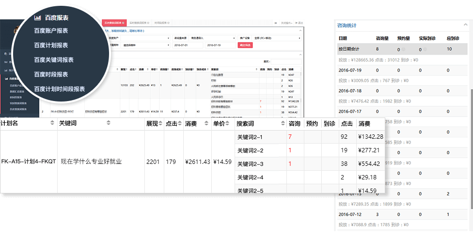 聚合百度、商務通數據,提供多種自定義生成數據報表、咨詢員報表、專業報表、推廣渠道報表、咨詢方式報表、關鍵詞報表;同時報表都可生成柱狀圖或折線圖,并且可以下載EXCLE表格。